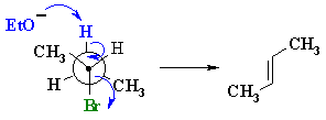 In this staggered conformation with the methyl groups anti, the H is anti to the Br leaving group giving trans-2-butene. With the H anti to the Br, the methyl groups are a less stable gauche relationship. This leads to the cis-alkene