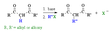 | Step 2: The nucleophilic enolate attacks the alkyl halide at the electrophilic carbon carrying the halogen via an SN2 type process giving the alkylation product and a bromide ion. |