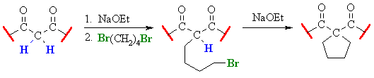 | Step 1: First, an acid-base reaction. The ethoxide functions as a base and removes an acidic a-hydrogen from between the two carbonyl groups giving the reactive enolate. |