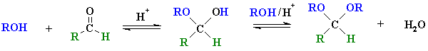 The mechanism by which aldehydes or ketones are converted to acetals or