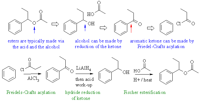 The schemes below give possible syntheses of the targets. There are of course other variations. The first part for each compound gives a "retro-synthesis", the "plan" and then the required forward synthesis with reagents is given. Red arrows try to show carbon-carbon bond forming reactions, blue arrows are functional group manipulations. The blue text rationalise the retrosynthetic analysis and information about important reactions are given in green.