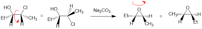 Working forwards, the reaction is the formation of an epoxide from a halohydrin via an intramolecular SN2 (where the Nu (OH) needs to attack at 180 degrees to the Cl (LG)). It's best to draw (or better still build a model) of the starting material in the reactive conformation to keep careful track of the stereochemistry: