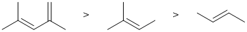 The reaction of alkenes with HCl is electrophilic addition and it is controlled by the stability of the carbocation intermediate and follows Markovnikov's rule. The conjugated diene gives a resonance stabilised tertiary carbocation (most stable), 2-methylbut-2-ene gives a tertiary carbocation and but-2-ene gives a secondary carbocation (least stable) so the alkene reactivity order is: