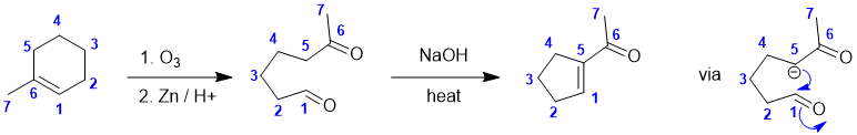 Working backwards.... The product is a cyclic system and enone (i.e. alkene ketone), which is potentially recognisable as the product of an aldol type condensation. This would be consistent with the reagents in step 3, a base and heat. "Reversing" the aldol reveals the keto-aldehyde which has been made by the ozonolysis of a cycloalkene (with a reductive work up)... counting C atoms will likely help here.