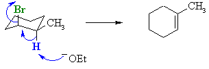 cis isomer with -Br axialFor the trans-isomer, when the -Br is axial  the methyl group is also axial. Therefore the elimination must occur from the C3-H bond giving the anti-Zaitsev product.