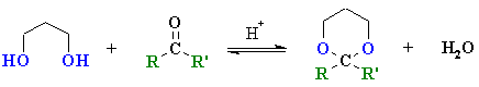 | Study Tip: The important "piece" of an acetal is the central C which becomes the C of the carbonyl C=O. It can be recognised by looking for the C that is attached to two O atoms by single bonds. |