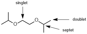 The number of lines = multiplicity (i.e. coupling) of the signals for each of the positions indicated is determined by the number of neighbours (n) that are of a different type and the n+1 rule. Here we see 7 lines (6 neighbours), a singlet and a doublet (1 neighbours). You need to remember that one doesn't observe coupling between H of the same type. |