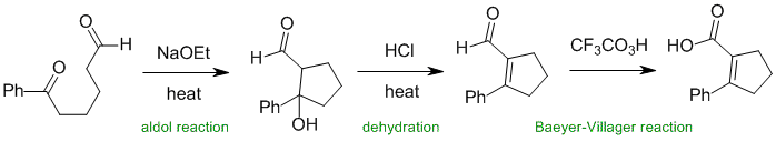 Working backwards.... the peracid looks to have produced the carboxylic acid from a Baeyer-Villager oxidation of an aldehyde, which reveals the enal type structure from an aldol condensation.