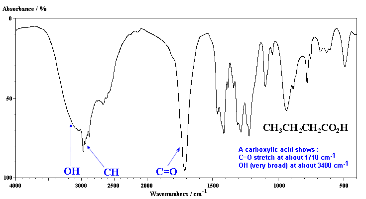 Carboxylic acids contain both C=O and OH groups. Note the broadness of both absorptions due to the hydrogen bonding and that the C=O is typically at slightly lower frequency than that of a ketone.