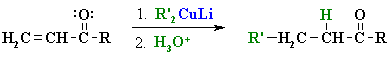 | Step 1: The nucleophilic C in the cuprate attacks the conjugated ketone at the electrophilic alkene C in a nucleophilic addition type process with the electrons being pushed through to the electronegative O, giving an intermediate enolate. |
