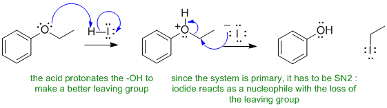 A Ethers react with strong acids like alcohols... need to make the O atom into a better leaving group by protonating before the nucleophile attacks or the leaving group leaves. Since neither side gives a stable carbocation, the reaction has to be SN2 and not SN1. Aryl systems don't undergo SN reactions, so it's the alkyl side that reacts with the iodide to give the ethyl iodide product.