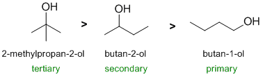 First identify the reaction.... the conditions of NaI/ acetone suggest an SN2 reaction of alkyl halides (think back to the laboratory expt). A quick look at the systems shows two bromides and an alcohol. HO- is a poor leaving group, so it will not react with NaI (hence the least reactive). Since the reaction is SN2, primary systems tend to be more reactive than secondary (due to steric hinderance). |