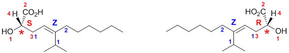 For the alkene (rankings shown in blue), consider the two ends separately. Towards the acid group, the C in the CH2 attached out ranks the H. At the other end, the C (C,C,H) outranks the C (C,H,H). So the two higher priority groups are on the same side, and hence this is a Z isomer (German; zusammen = together).