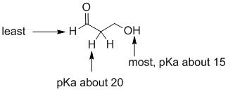 | Qu 6: | Alcohols (pKa about 15) are more acidic than aldehydes (pKa about 17-20) since the H involved is on an electronagtive O rather than C. FOr an aldehyde, it is the position adjacent to the C=O NOT the H attached to the C=O that is more acidic due to the extra resonance stabilisation of the enolate conjugate base. | ![]() |