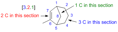 | Qu31: | The bicyclic system is an octene meaning 8C and an alkene. The [3.2.1] indicates the number of C is each link between the bridgehead carbons. Need to start to number from a bridgehead, going along the longer link first to locate C6 for the alkene and the methyl group. | ![]() |