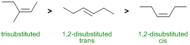 Alkene stability. Notice they are isomeric, C6H10. In terms of alkene stability, the general rule is the more alkyl groups on the C=C unit, the more stable it is and for chain systems, trans tend to be more stable than cis. | ![]() |