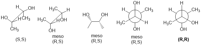 Use the Cahn-Ingold-Prelog rules to assign priorities to determine R/S configurations. You should be able to quickly spot the meso configurations which are (R,S) and can therefore ruled out (meso requires internal mirror plane or inversion center). This only leaves two structures that would need to be assigned.