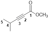 | Qu27: | The longest chain including the principal functional group (an ester) is C5, so we have a pent system. The C=O defines C1 with the triple bond at C2-C3 and a methyl group at C4. The alcohol portion of the ester is C1 = methyl. Therefore we have methyl 4-methylpent-2-ynoate (v1=AB, v2=A) | ![]() |