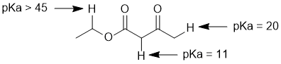 | Qu 3: | Acidity.... Need to look at the stability of the conjugate bases and consider the factors that affect that stability. We have 3 CH systems that are adjacent to different groups. We have a methylene (CH2) between two C=O, a methylene next to an O and a methyl group (CH3) next to a C=O. A -ve charge on a C atom adjacent to a C=O will be stabilised by resonance (enolates) and two adjacent C=O will provide more resonance stabilisation that an single C=O. |