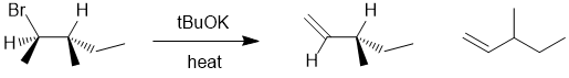 | Qu20: | We should work forwards, we are doing dehydrohalogenation of alkyl halides, i.e. an elimination of an alkyl halide to an alkene using a strong base / heat, an E2 elimination. We should note that it is then an anti-Zaitsev elimination giving the less highly substituted alkene. | ![]() |