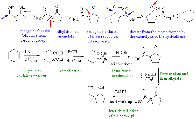 forward synthesis with reagents is given. Red arrows try to show carbon-carbon