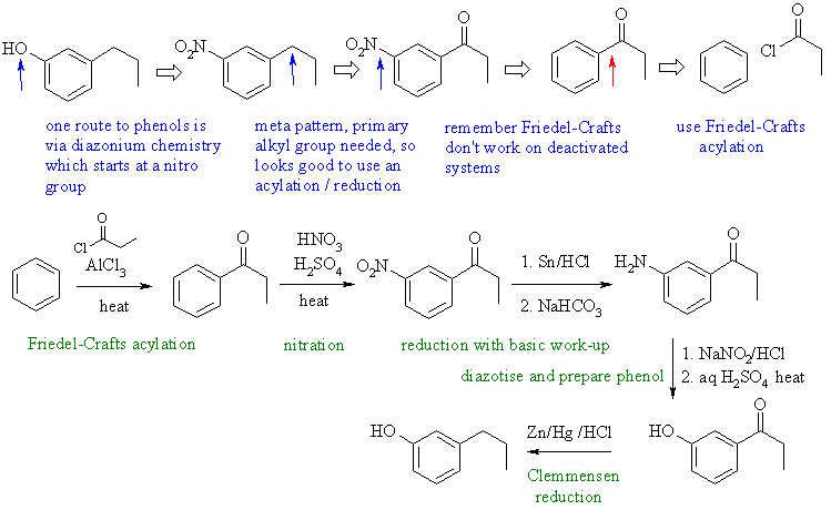 The schemes below give possible syntheses of the targets. There are of course other variations. The first part for each compound gives a "retro-synthesis", the "plan" and then the required forward synthesis with reagents is given. Red arrows try to show carbon-carbon bond forming reactions, blue arrows are functional group manipulations. The blue text rationalise the retrosynthetic analysis and information about important reactions are given in green.