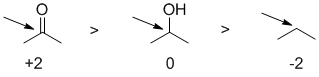 Oxidation states...The easiest way to reach the answer is based on the knowledge that ketones can be reduced to alcohols. More formally, we count the bonds attached to the atom being considered. A bond to a more electronegative atoms counts -1, a bond to the same type of atom counts 0 and a bond to a less electronegative atom (e.g. H) counts +1. Total the count and then consider the formal charge on the central atom since the oxidation state for the central atom plus the groups attached must equal the atoms formal charge. For the ketone, the C is attached to 2 x O (count - 1 each, total -2) and C (count 0) therefore total = -2 and therefore the oxidation state C = +2. In the alcohol, the C is attached to 1 x O (count - 1), 2 x C (count 0) and H (count +1) therefore total = 0 and therefore the oxidation state C = 0. In the alkane the C is attached to 2 x C (count 0), C and 2xH (count +2) therefore total = +2 and therefore the oxidation state C = -2.