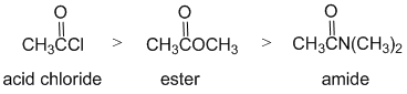 The reactivity of carboxylic acid derivative carbonyl groups of an acid chloride, an ester and an amide towards hydrolysis. The electronic factors of each of the substituents / leaving group on each of the carbonyl groups need to be considered. In the chloride, is an electron withdrawer (inductive) and a good leaving group. In the ester, the -OR group, the methoxy group is a strong electron donor and a poor leaving group. In the amide, the NHR group, is a strong electron donating group and a very poor leaving group. Electron donors on the carbonyl make the carbon less electrophilic and less reactive, a better leaving group makes the acid derivative more reactive. Hence in terms of reactivity: