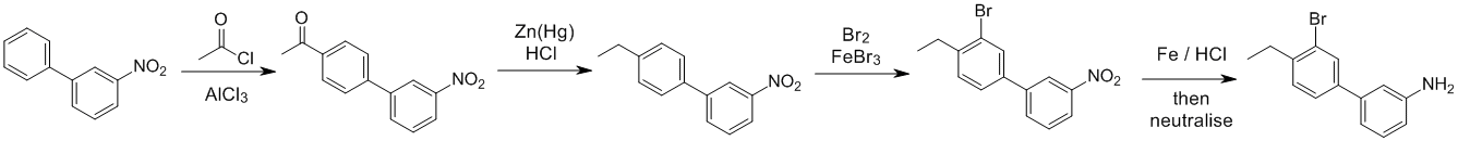 acylation. on the more activated ring (not the nitro substituted ring). This is followed by a Clemmensen reduction to convert the carbonyl group into a methylene. The third step is a another aromatic substitution, bromination (again on the more activated ring) then reduction of the nitro group to the amine.