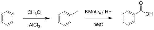 acylation between an acid chloride and benzene to make the aromatic ketone which can then be oxidised to the give the aromatic carboxylic acid. Grignard reagents, RMgX, don't react with benzene rings, and to make a carboxylic acid using Grignard chemistry, you need a halide. We need to use i. CH3Cl / AlCl3 ii. KMnO4 / H3O+ / heat.