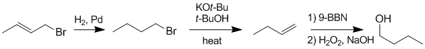 Working forwards...catalytic hydrogenation of the alkene to the alkyl group followed by elimination of the alkyl bromide to give but-1-ene. This is followed by hydroboration/oxidation which gives the anti-Markovnikov alcohol.