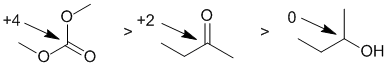 Oxidation states...The easiest way to reach the answer is based on the knowledge that ketones can be reduced to secondary alcohols. The other structure is a carbonate, a special type of ester. More bonds to O typically means a higher oxidation state. More formally, we count the bonds attached to the atom being considered. A bond to a more electronegative atoms (e.g. O) counts -1, a bond to the same type of atom counts 0 and a bond to a less electronegative atom (e.g. H) counts +1. Total the count and then consider the formal charge on the central atom since the oxidation state for the central atom plus the groups attached must equal the atoms formal charge. For the ketone, the C is attached to 2 x O (count - 1 each, total -2) and 2 x C (count 0) therefore total = -2 and therefore the oxidation state C = +2. In the secondary alcohol, the C is attached to 1 x O (count -1), 2 x C (count 0) and 1 x H (count +1) therefore total = 0 and therefore the oxidation state C = 0. In the carbonate ester the C is attached to 4 x O (count -4) therefore total = -4 and therefore the oxidation state C = +4.