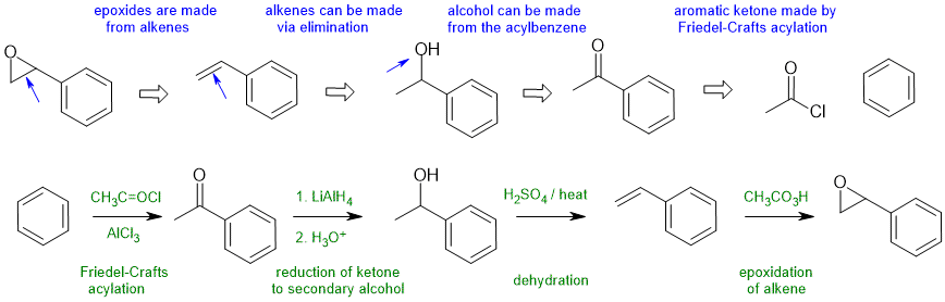 When planning syntheses, one should try to work backwards by functional group analysis. The diagrams show the "retrosynthesis" - the design or plan and then below that the reaction scheme step-by-step (as required in the question). Red arrows try to show carbon-carbon bond forming reactions, blue arrows are functional group manipulations. The blue text rationalise the retrosynthetic analysis and information about important reactions are given in green.