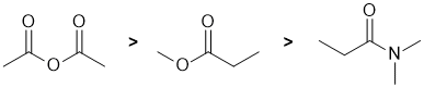 The reactivity of carbonyl groups in carboxylic acid derivatives towards aq. acid where the systems undergo nucleophilic acyl substitution. The electronic effect and leaving group ability of each of the substituents on each of the carbonyl groups need to be considered. Electron withdrawing groups on the carbonyl make the carbon more electrophilic (and hence more reactive). Better leaving groups also increase the reactivity of the acid derivative. Hence, in terms of reactivity towards aq. acid, acid anhydrides are more reactive than esters which in turn are more reactive than amides, i.e. we have: