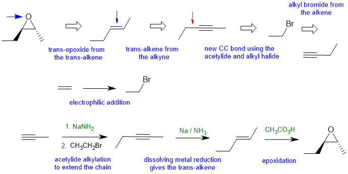 When planning syntheses, one should try to work backwards by functional group analysis. The diagrams show the "retrosynthesis" - the design or plan and then below that the reaction scheme step-by-step (as required in the question). Red arrows try to show carbon-carbon bond forming reactions, blue arrows are functional group manipulations. The blue text rationalise the retrosynthetic analysis and information about important reactions are given in green.